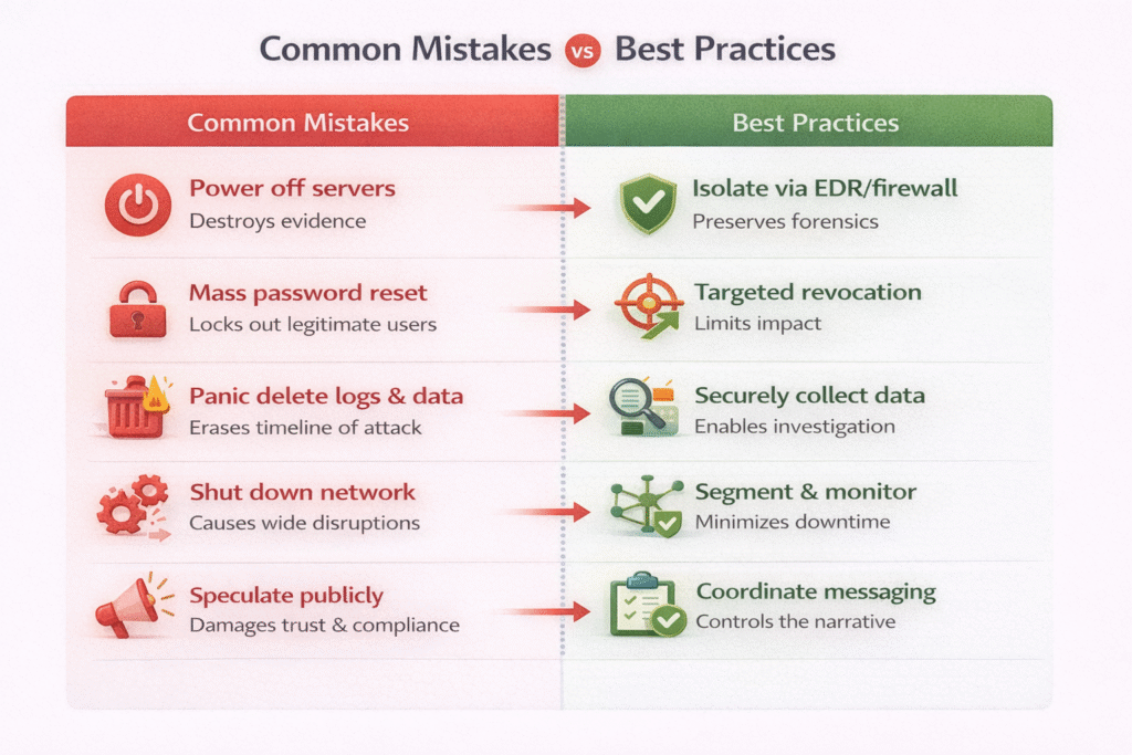 • Contain surgically — segment and monitor rather than mass shutdowns or resets.
