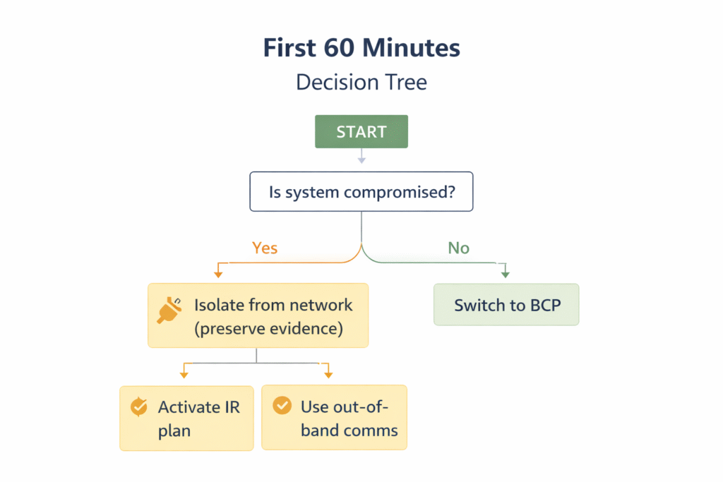 • First 60 minutes: Isolate affected systems, activate your incident response plan, and switch to out-of-band communications.